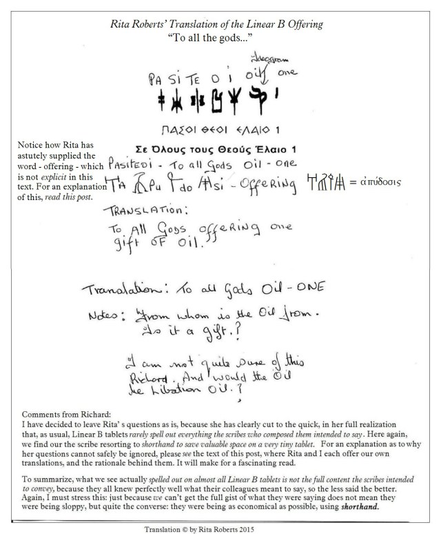 Linear B “To all the gods... ” There is much more than meets the eye in Rita Roberts’ Astute Translation: Click to ENLARGENow that Rita has been translating tablets from Linear B into English for well over a year, she has come to learn quite a few tricks of the trade, and is well aware of the numerous pitfalls that beset translators of Mycenaean Greek, who can and all too often do fail to “read” everything that the scribes meant to convey, leaving unsaid what they all knew perfectly well they actually were saying to one another, regardless of inventorial context. This phenomenon occurs over and over on the majority of Linear B tablets, and always for the same reason: the scribes were forced to save as much valuable space as they possibly could on a very small, cramped medium, the Linear B tablet. They quickly became…