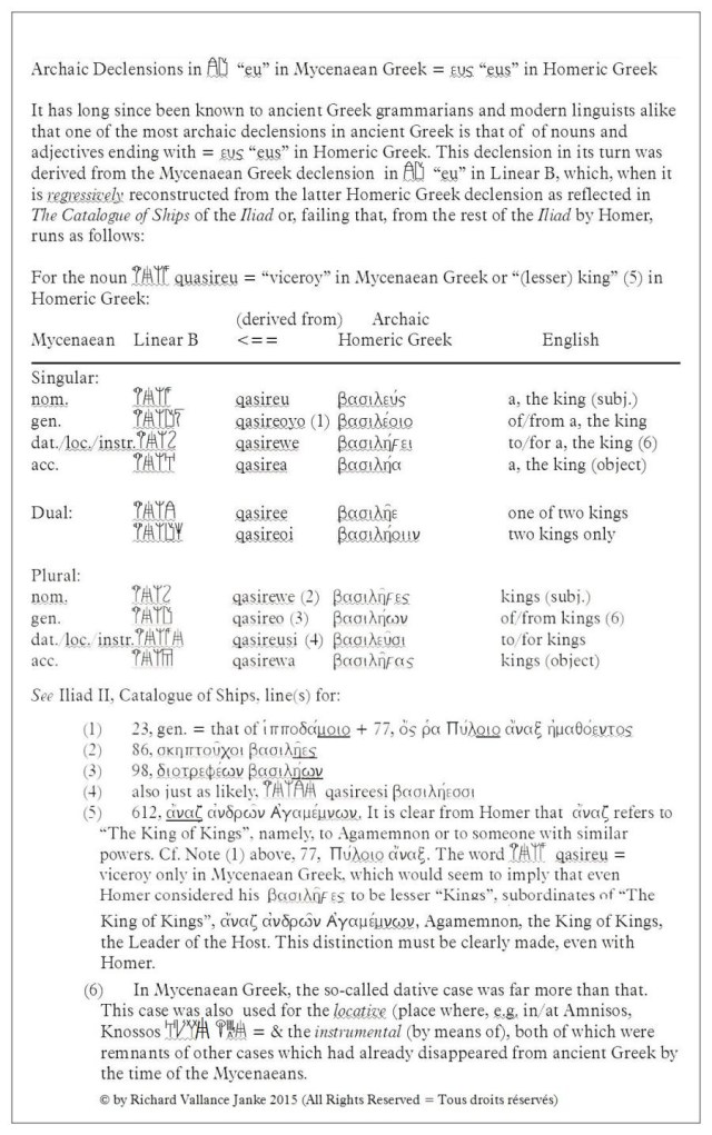 Archaic Declensions in “eu” in Mycenaean Greek = “eus” in Homeric Greek: Click to ENLARGEOne of the most archaic declensions in ancient Greek is the Athematic Third Declension in which nouns in the nominative end in “eus” in Homeric Greek or “eu” in Mycenaean Greek, as illustrated by the complete declension table above of the noun “qasireu” = “viceroy” in Mycenaean Linear B, and of “basileus” = “(lesser) king” in Homeric Greek. The process whereby I can reasonably reconstruct any verb conjugation or any nominal or adjectival declension from the Homeric Greek of The Catalogue of Ships in Book II of the Iliad or, failing that, from Book II of the Iliad, I call regressive extrapolation. In the table of the athematic third declension above for “qasireu” = “viceroy” in Mycenaean Linear B, very few forms are already attested…