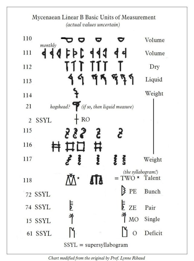 Mycenaean Linear B Units of Measurement (Liquid, Dry & Weight): Click to ENLARGEThis table illustrates the syllabograms, logograms & ideograms used to represent units of measurement, liquid, dry and by weight. As can clearly be seen, the exact values many of the units are uncertain. I have hazarded a guess that the unit of measurement in this table which is represented by the ideogram for sheep may very well be the agricultural unit, a hogshead, in which case it is a liquid unit of measurement. Even that unit is variable, ranging anywhere from 46 to 65 US imperial gallons, with several stops in between. So if the Mycenaean measurement is anything like a hogshead, then it is probably just as unreliable, especially in light of the fact that the Mycenaean unit is ancient. Ancient units of measurement were notoriously variable. After all, if merchants could cheat, they would…