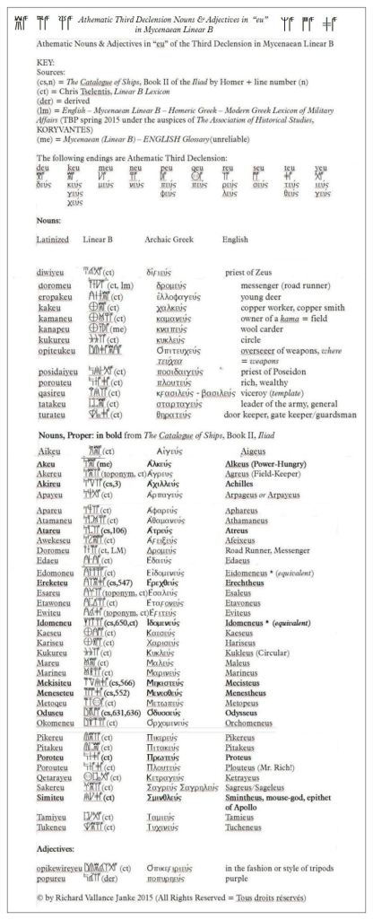 Table of Athematic Third Declension Nouns & Adjectives in “eu” in Mycenaean Linear B: Click to ENLARGENOTE: this table took me 12 hours (!) to compile. I sincerely hope that some of our visitors will acknowledge this in some way or other, by tagging the post with LIKE, assigning it the numbers of STARS they believe it merits, by re-blogging it, posting it on Facebook, tweeting it, posting it on Scoopit, whatever... Based on the template declension of the noun qasireu = “viceroy” in Mycenaean Linear B, itself derived in large part from extant archaic forms in The Catalogue of Ships of Book II of the Iliad by Homer, we have here all of the nouns, including proper, and adjectives I have been able to cull from various sources, all of which are referenced in the KEY at the top of the table.There are a few items in…