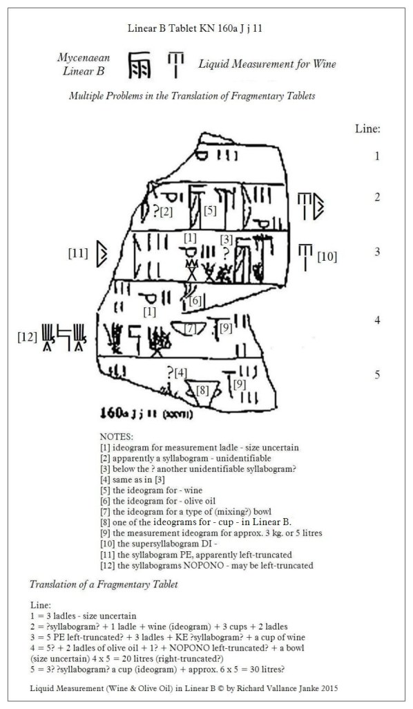 My Cup Runneth Over! Liquid Measurement for Wine & Olive Oil in Mycenaean Linear B: Click to ENLARGEBecause it is damaged and fragmentary, a decent translation of this tablet is unattainable. But this is no excuse for not taking a stab at it. The several notes appended to the end of the tablet highlight the multiple problems facing the translator confronted with a fragmentary tablet in Linear B, let alone any other ancient script. Some difficulties are dependent on the nature (i.e. type) of script itself (hieroglyphs, cuneiform, a syllabary or an alphabet), hence, script-dependent. Taking our notes step by step:[1] The difficulty posed by this ideogram for a “ladle” arises from the fact that we have no idea of the size of ladle (if that is what it is) the Linear B scribes were referencing. This problem is exacerbated by further considerations below.[2] I am…