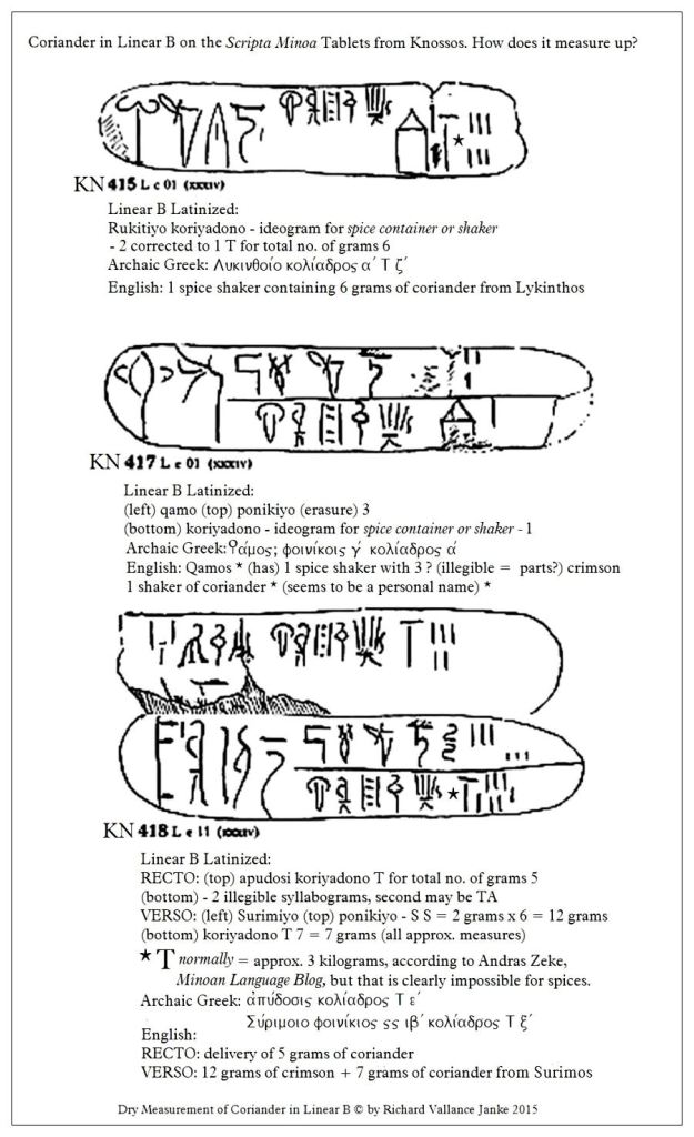 Coriander in Linear B. How does it measure up? Big time! Click to ENLARGEThe translation of these three sequential * tablets is a straightforward affair ( * sequential because I have already translated KN 416). As I mentioned in a previous post, the Minoans & Mycenaeans at Knossos, Phaistos Lykinthos, Surimos, Pylos, Mycenae and elsewhere were crazy about coriander, because that is all they ever talk about on their inventory tablets referencing spices. The only thing that perplexed me at the outset on these tablets was the reference to crimson on tablets KN 417 L e 01 & KN 418 L e 11. I simply could not figure out why the total no. of grams for crimson were at variance with those for coriander. It is obvious to any experienced cook or chef that I know next to nothing about spices. This is unquestionably the reason why initially I…