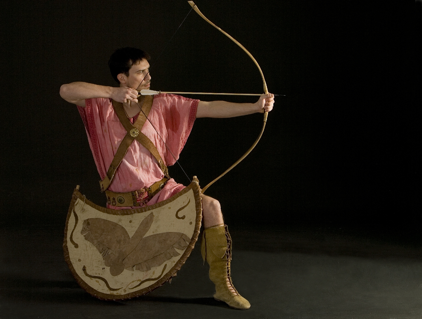 Φωτογραφία: Αναπαράσταση Έλληνα Τοξότη της Κλασσικής Περιόδου , με πέλτη ,Θρακικές ενδρομίδες, και Σύνθετο Σκυθικό Τόξο σε στάση βολής. Χαρακτηριστικό ειναι το τράβηγμα του βέλους που πραγματοποιείται απο το ύψος του στήθους, όπως απεικονίζεται σε αγγεια της περιόδου ,φωτογραφία του Ανδρέα Σμαραγδή. Σύλλογος Ιστορικών Μελετων ΚΟΡΥΒΑΝΤΕΣ